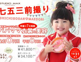 スタジオマックス恒例の七五三早撮りキャンペーン第一弾がスタートしました(^▽^)/ キャンペーン内容は『パパママ衣装着付無料』や『お出かけ衣裳平日レンタル0円 .....